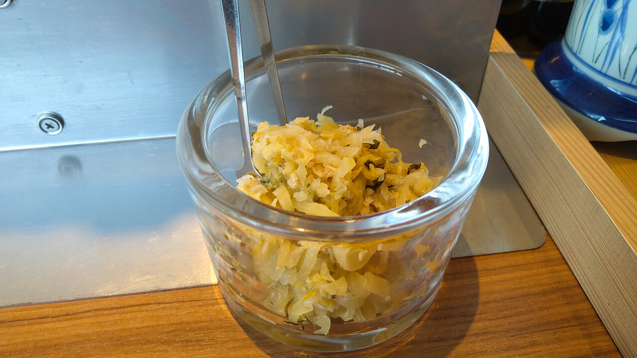 出汁を入れ、卓上の漬物を乗せてみました。この出汁がなかなかで、しっかり味のかつお出汁。真面目な話、これがあったら味噌汁いらないかも。
