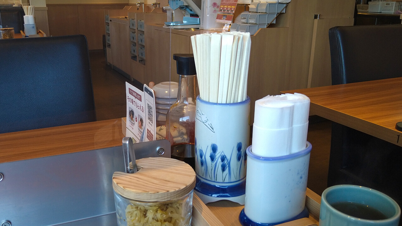 卓上には、醤油・七味・楊枝・小皿・紙ナプキン・漬物・割り箸がスタンバイ。