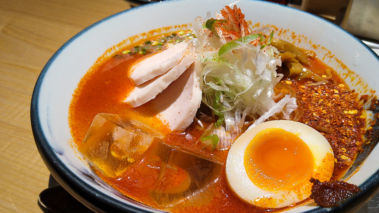 鶏チャーシュー・メンマ・ネギ・味玉・粗挽き唐辛子・柚子辛紅醤・氷がトッピング。