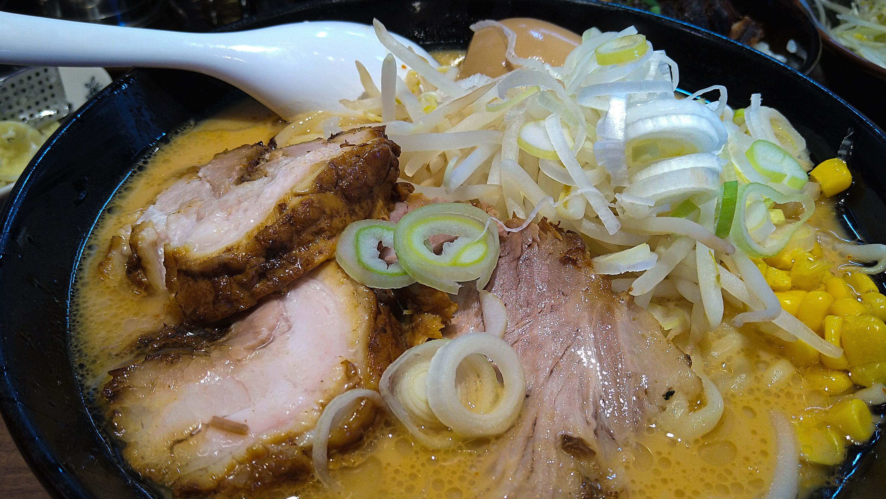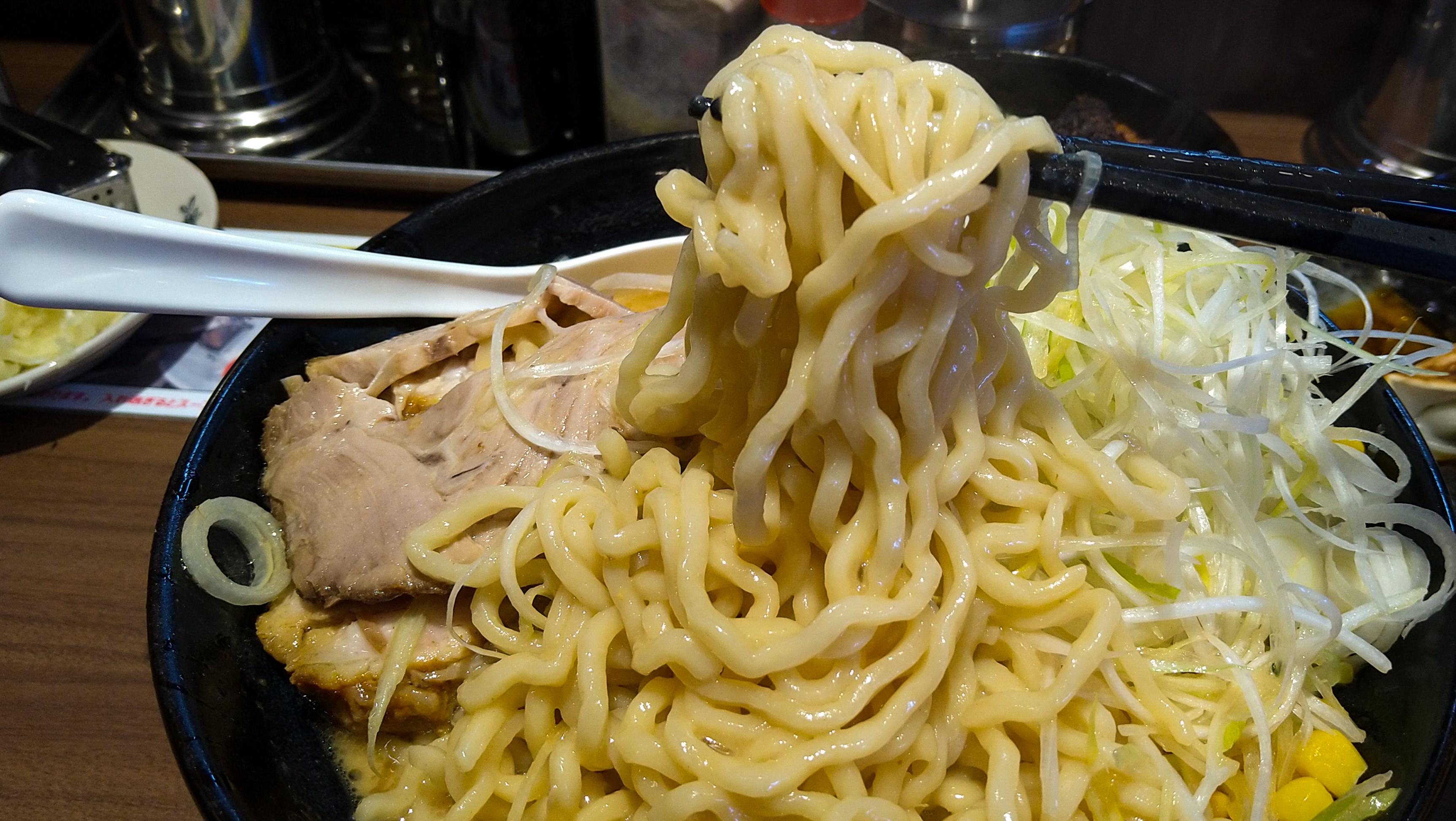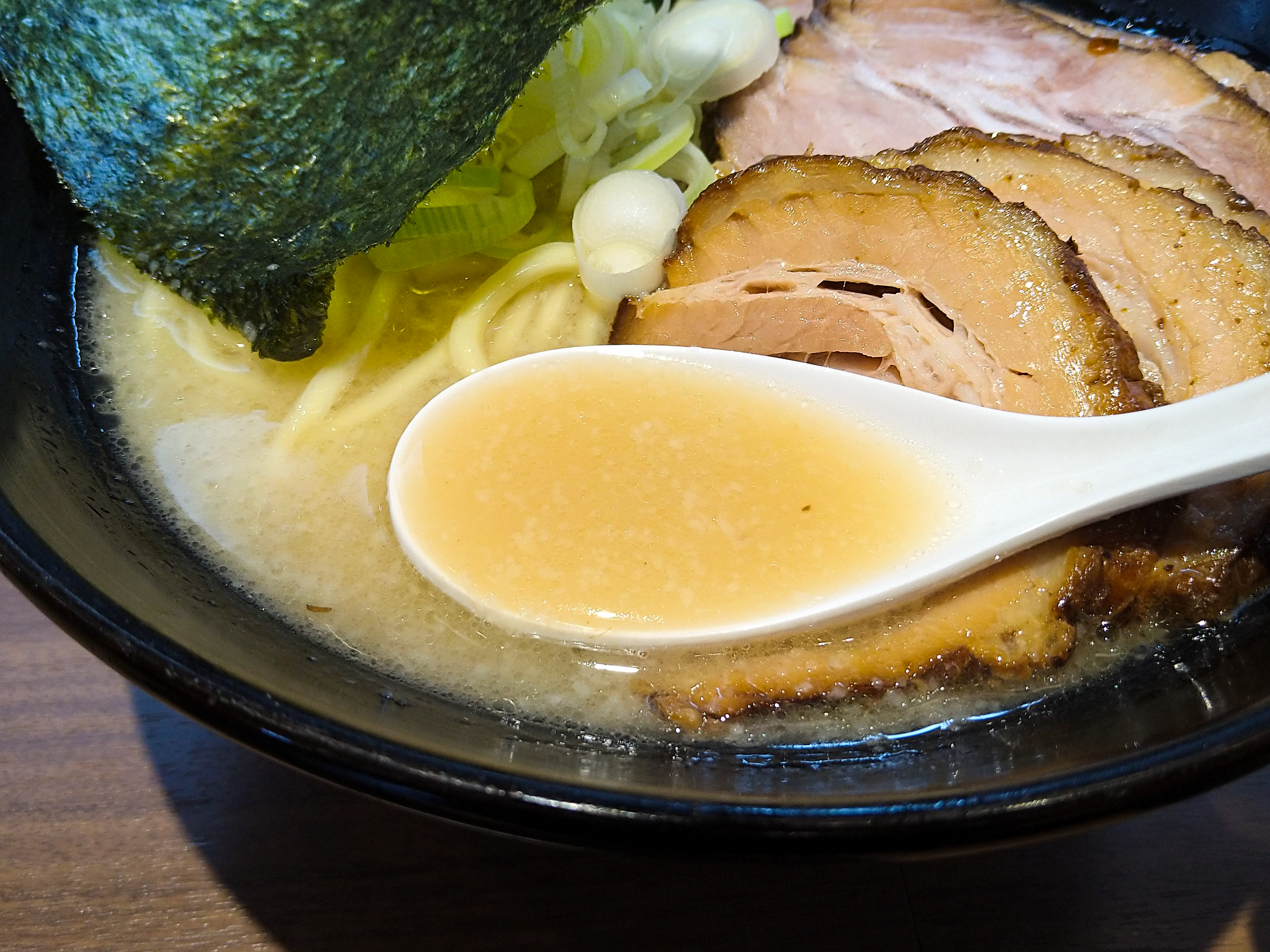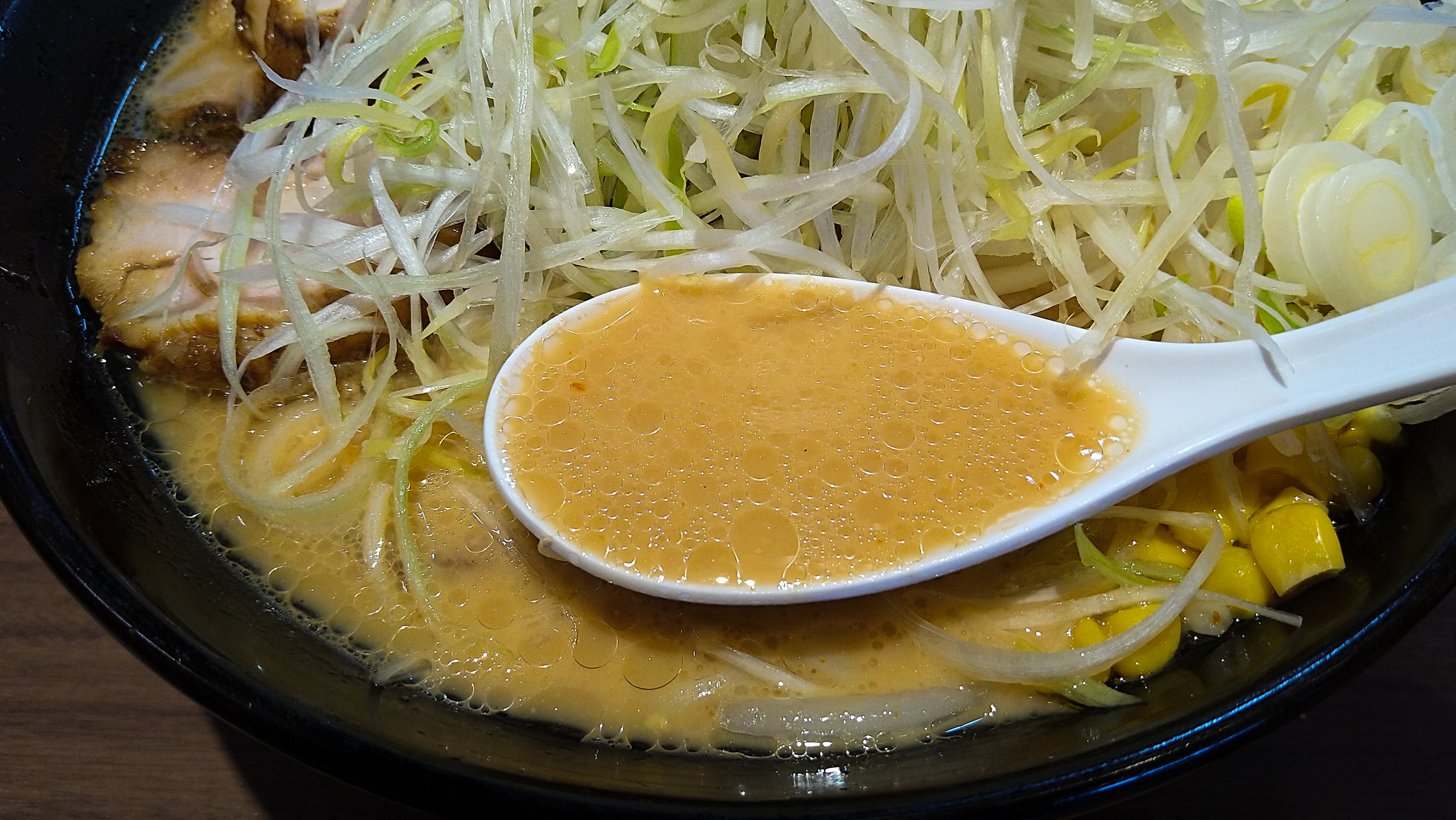 濃いめ・多めにしたわりには、かなりライトな口当たりの塩スープ。味噌や醤油と比べるとエッヂが弱い分、ベースのマイルドな豚骨を一番堪能出来るかも。