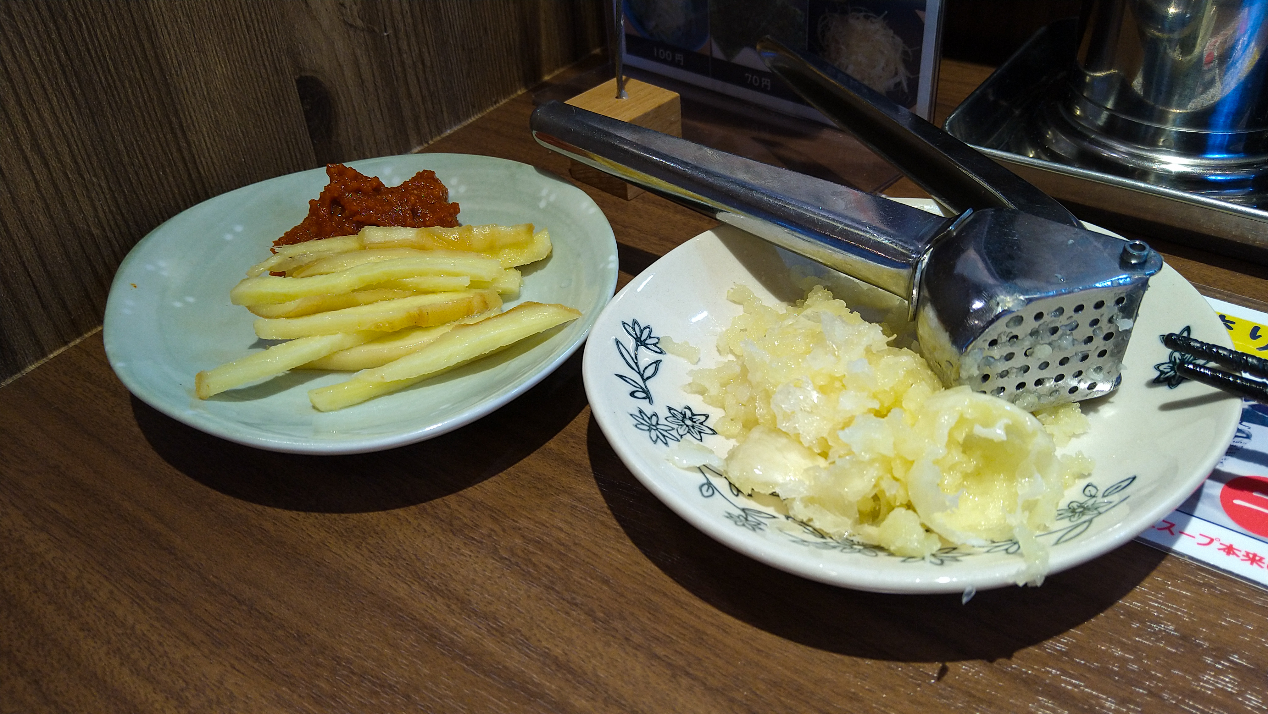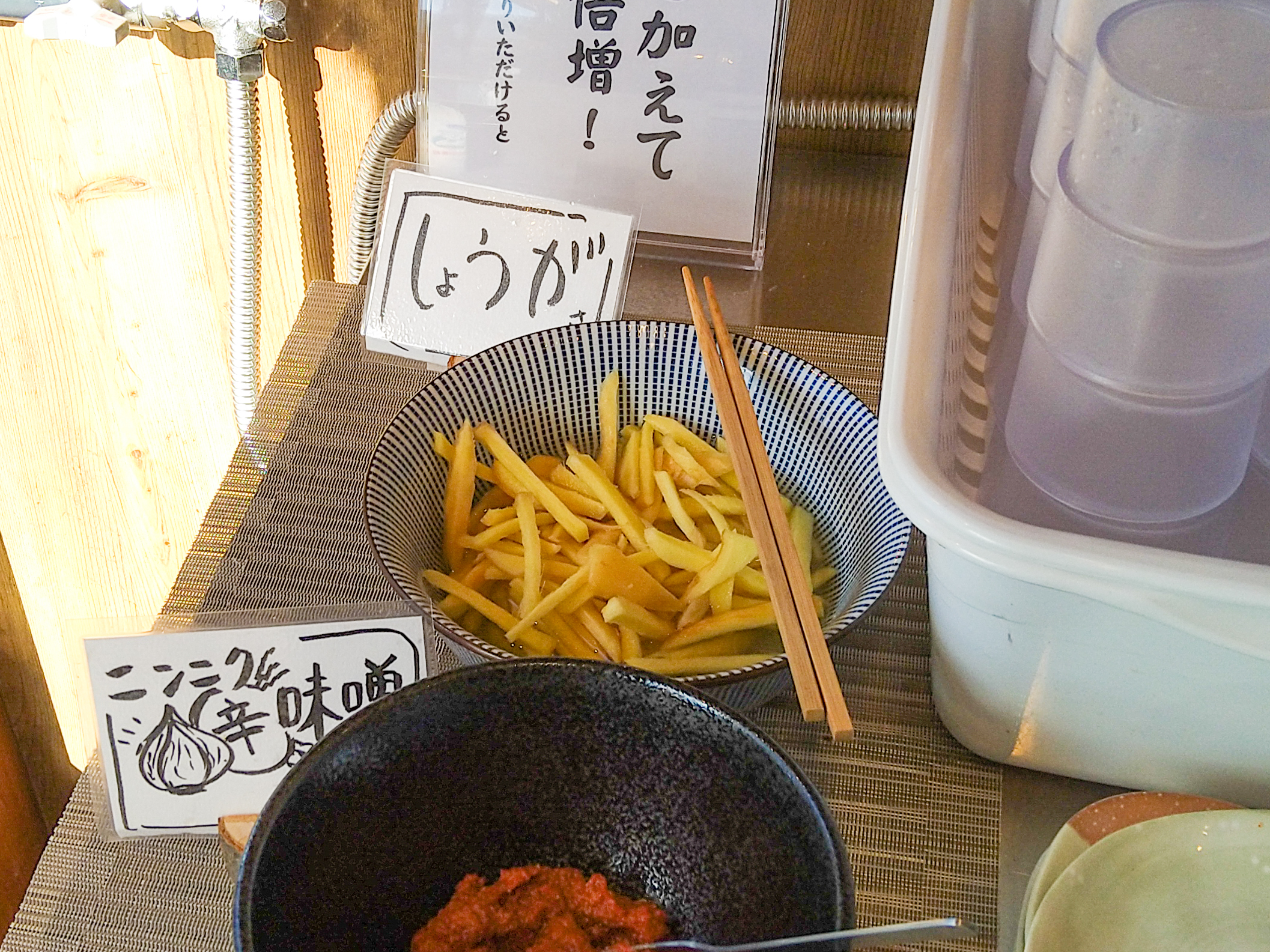 で、こちらを投入するわけ。手前はツナのようにも見えるけど、実は生姜!前回まであった短冊切りの生姜とは違い、甘酢に漬けたガリっぽい感じ仕様に変更されていた。ちなみに奥はニンニク4個をクラッシュさせたもの。