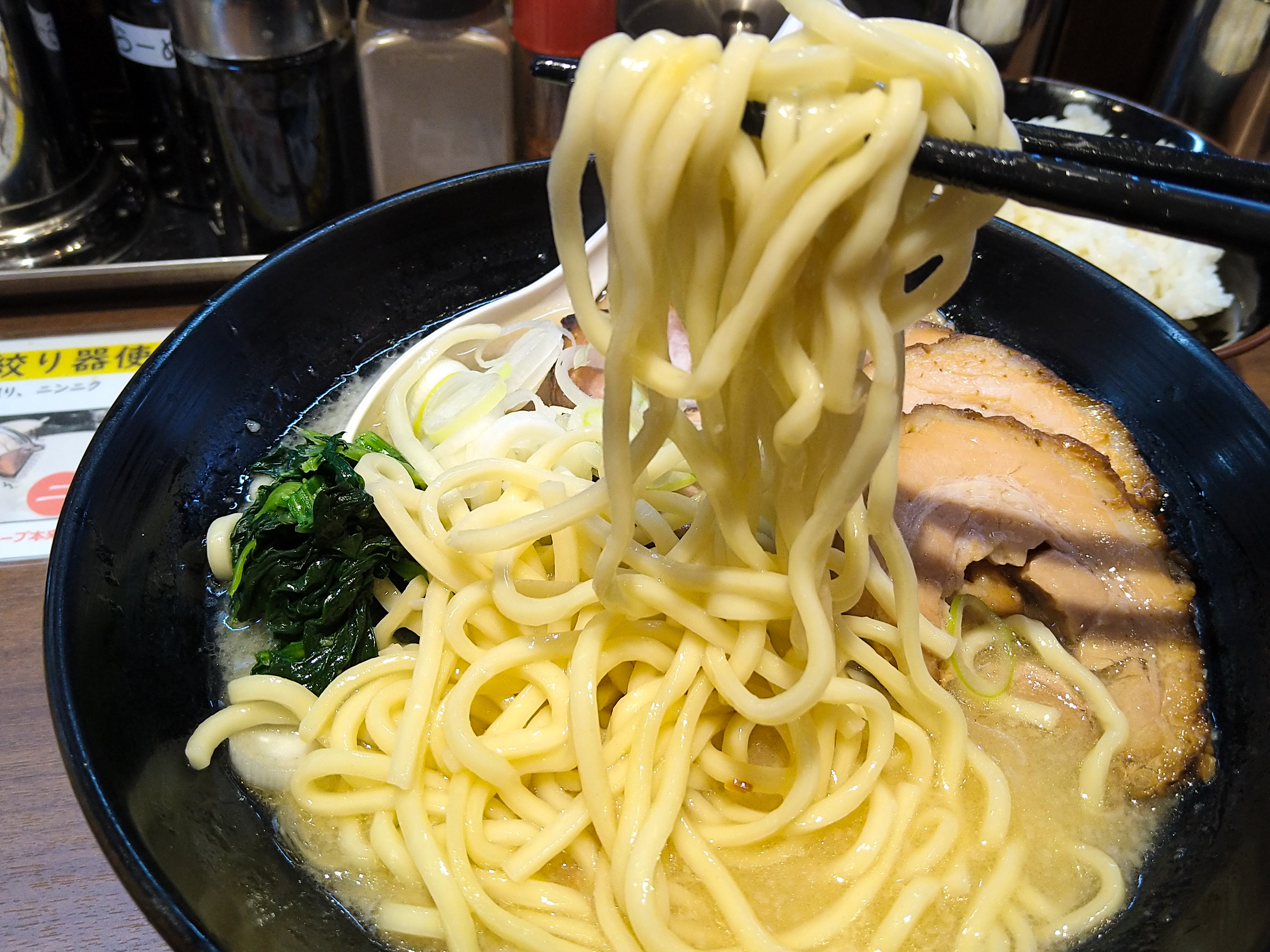 麺は他と同じもの(だろう)。如何にも家系っぽいチュルっとした麺肌に、気持ち短い太麺が使われている。