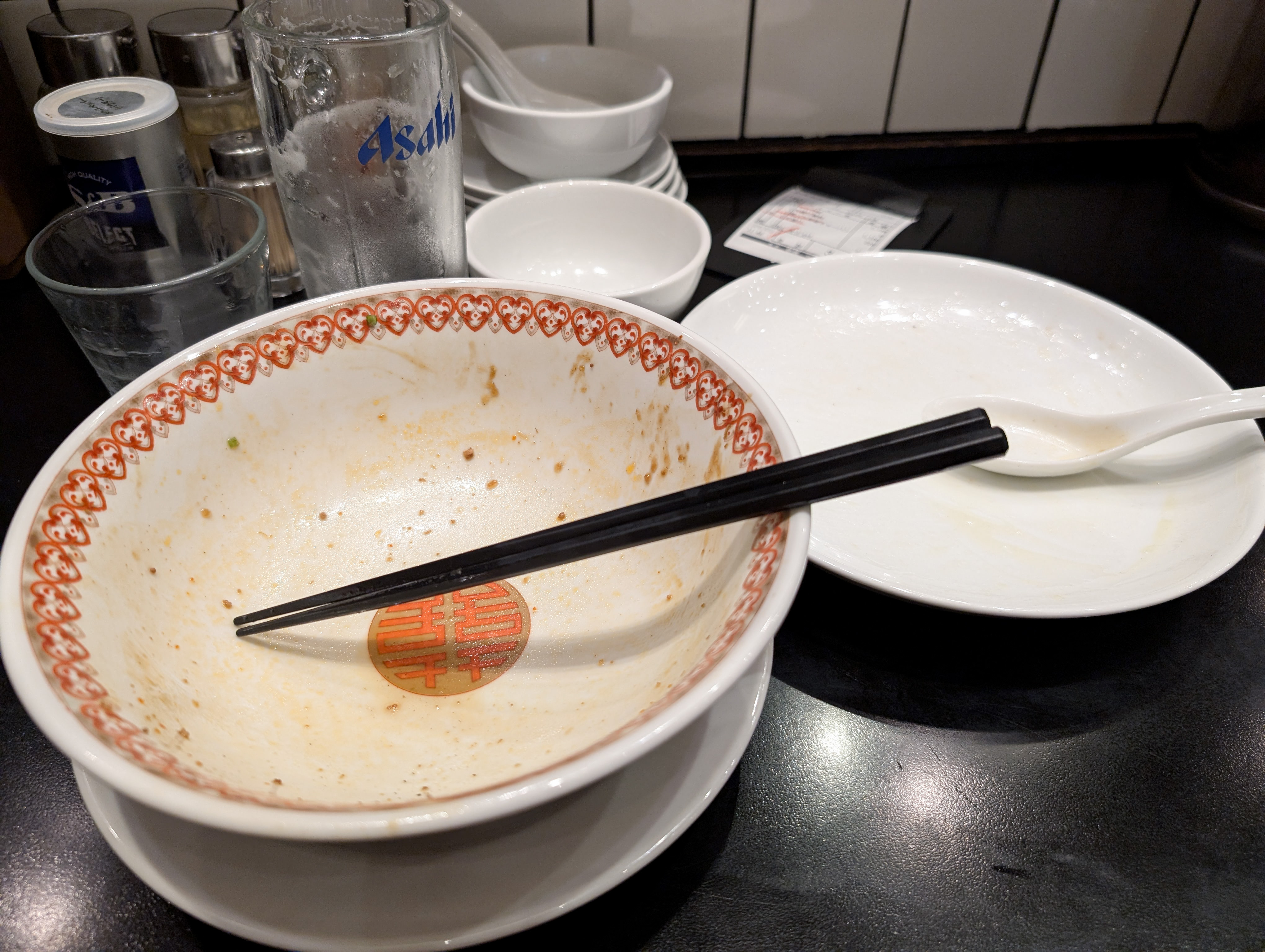 なによりこの麺が凄く好み。時間がたってもダレる感じもしないし、みっちみちに入っていて食べ応えも抜群。小麦の風味こそ感じなかったけど、すすり心地といい、パツっとした歯切れといい、スープや具材の邪魔をしないで己をちゃんとアピれる優等生。噂ではメニュー毎に麺を使い分けている説もあるので、食べ始めたばかりだけどリピート確定。