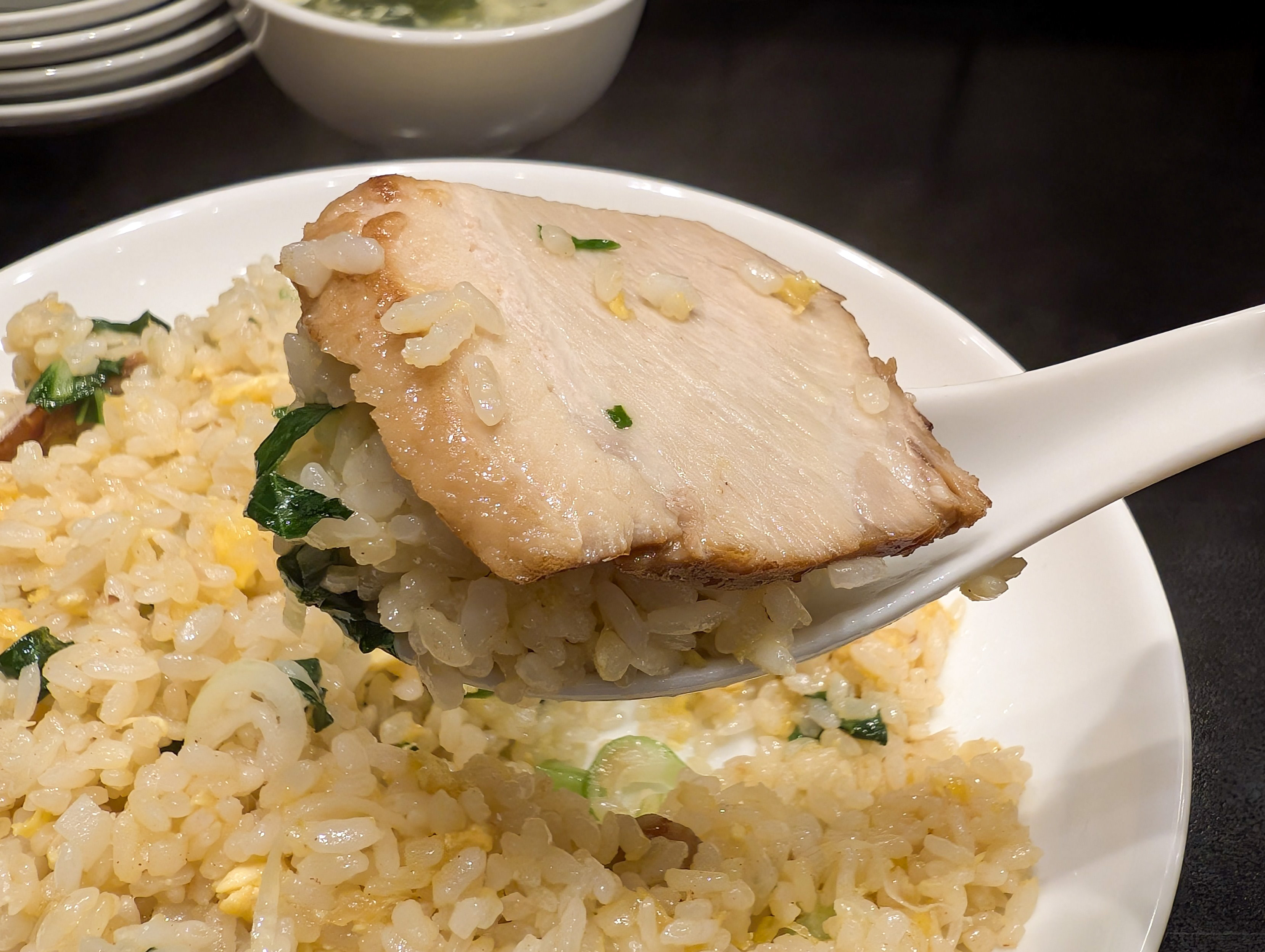 厚切りの豚バラも素敵! 適度な肉みがあって、一緒に食べることでチャーハンの深みが増してくる。あえて肉を見せるように盛り付けるわけでもなく、一緒に炒(チャー)されてそのまま皿にバサっと盛る気取らなさも素敵。味に自信があるってことだね。