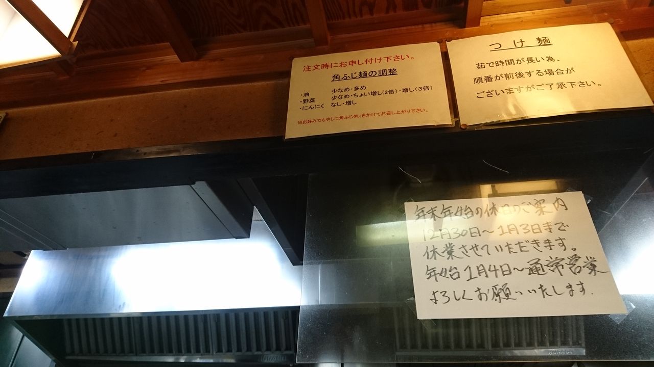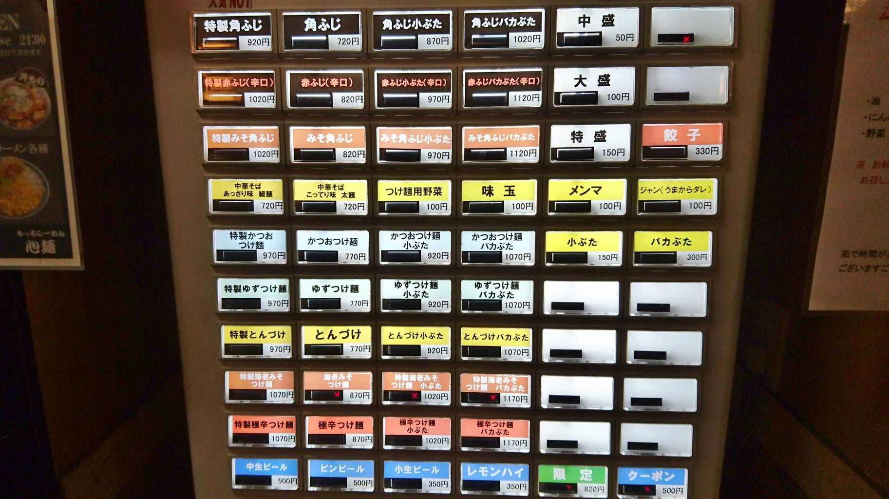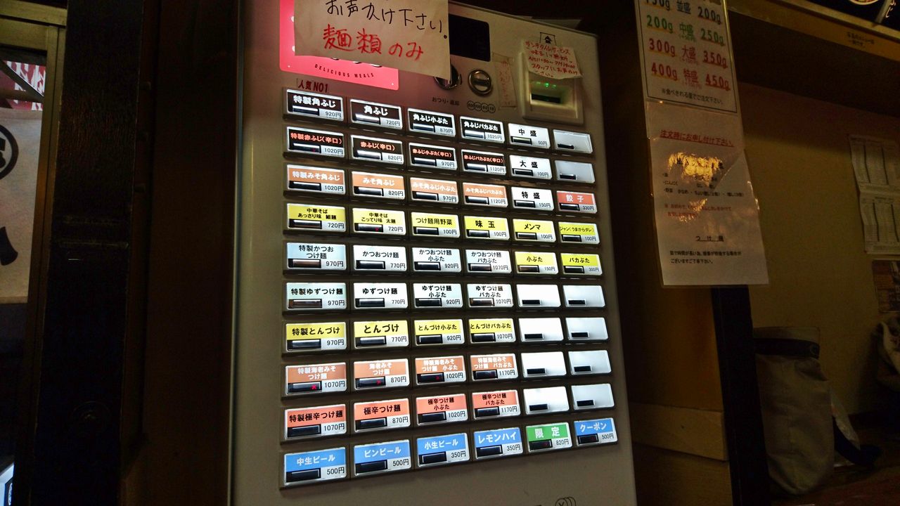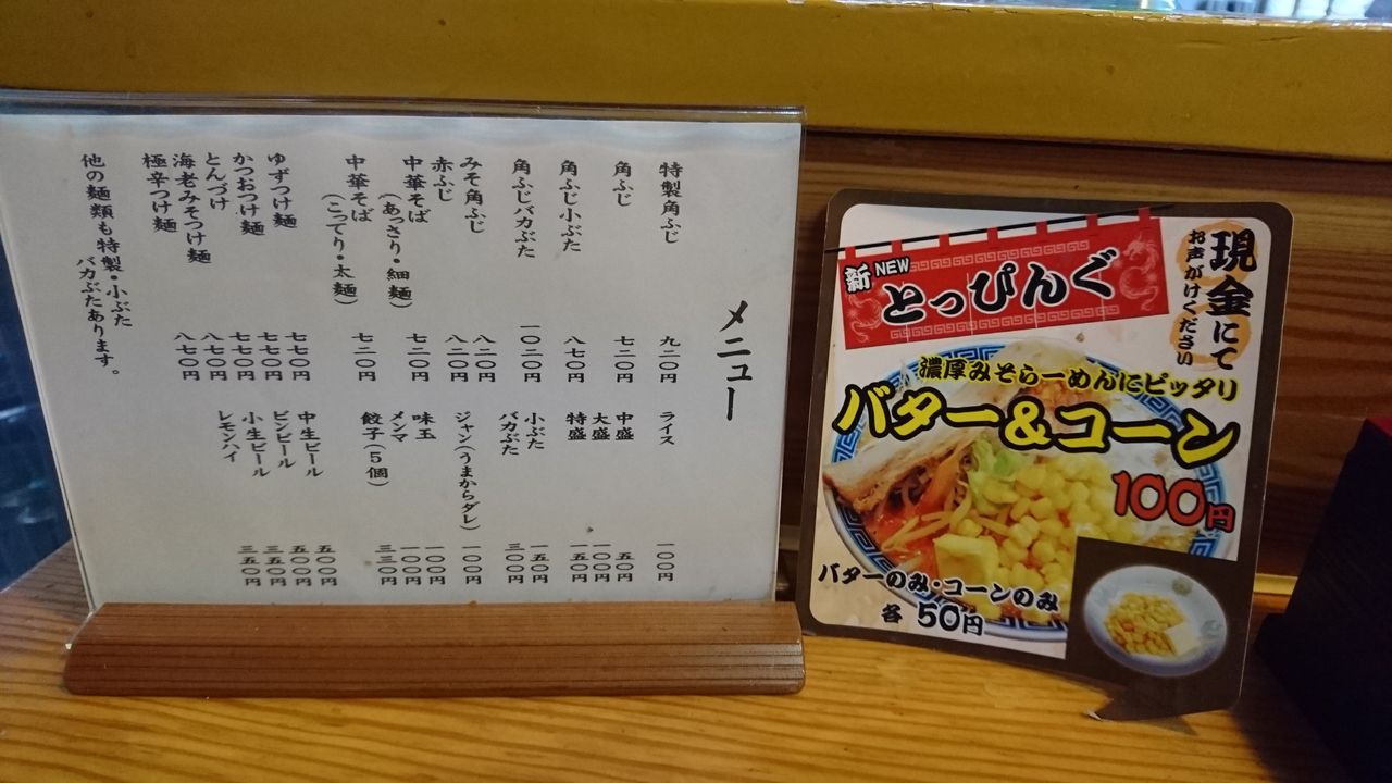 券売機のメニュー構成は全く変わらずですが、水土限定だった「みそ角ふじ」がレギュラーに変更されています。偶々なのか「こってり中華そば」と「えび味噌つけ麺」には売切れランプが点灯中でした。