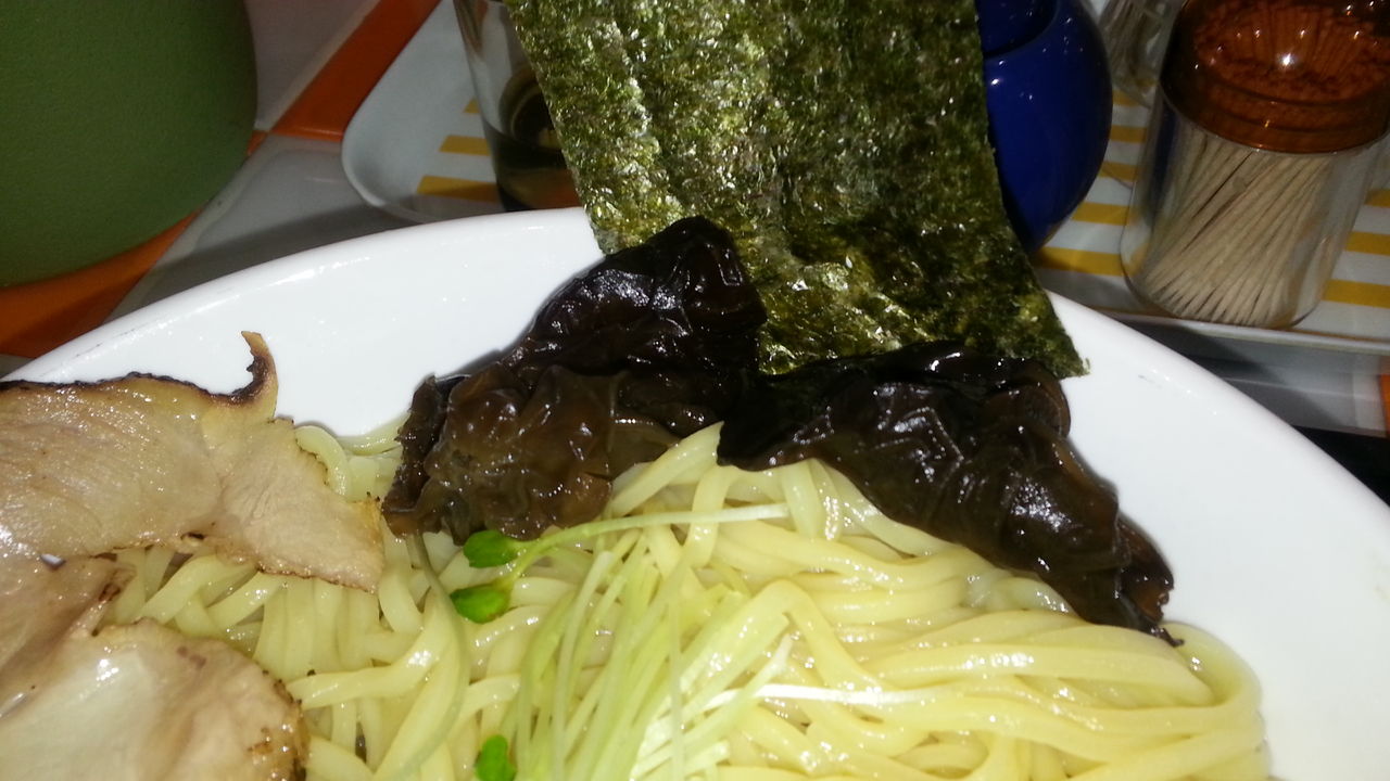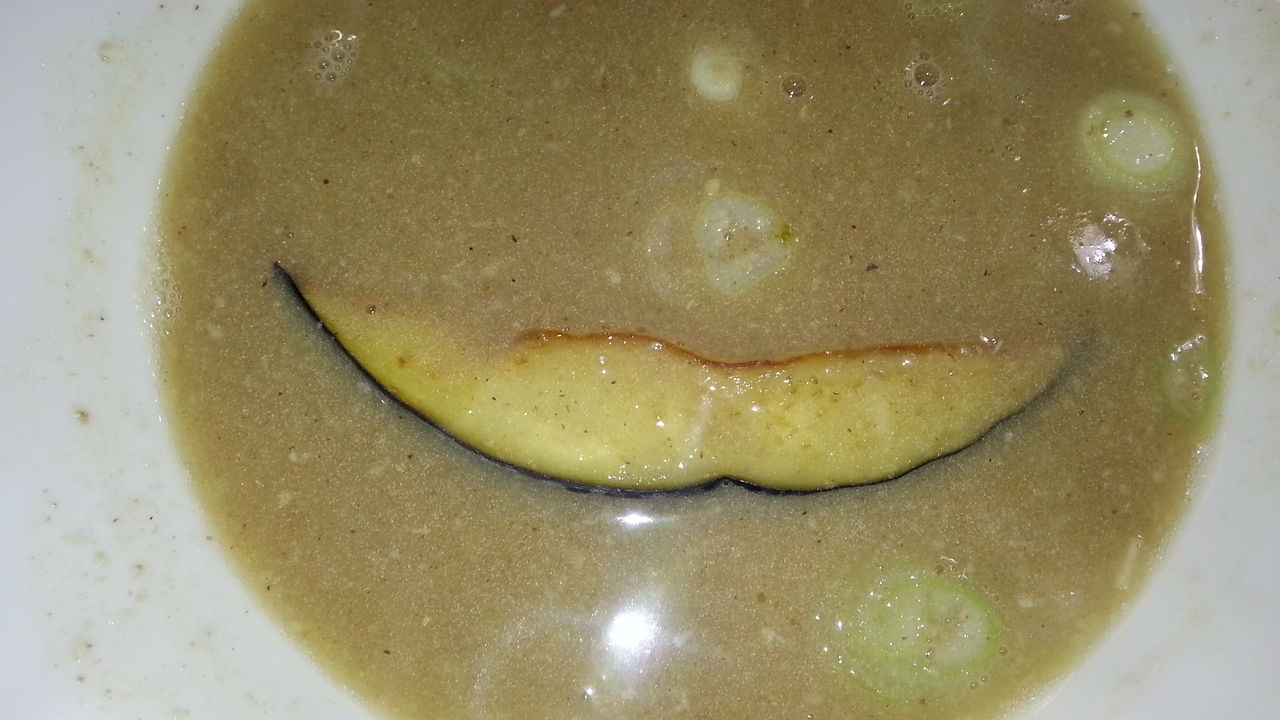揚げナスは味が染みていて、このつけ汁と相性が良さそうだ。キクラゲは肉厚なものが2個入っていてほとんど無味だが食感が楽しめます。この2品は他店では見かけないトッピングなだけに面白い。