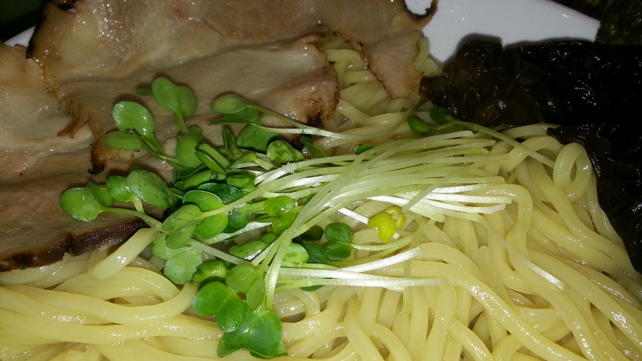 カイワレだ。こいつは喉に突き刺さるやつだから注意しよう。大盛りの400グラムは初見では茹で後ってところのようですね。つけ汁に浮かぶナスの姿が何とも意味深い、まるで笑っているようだ・・・
