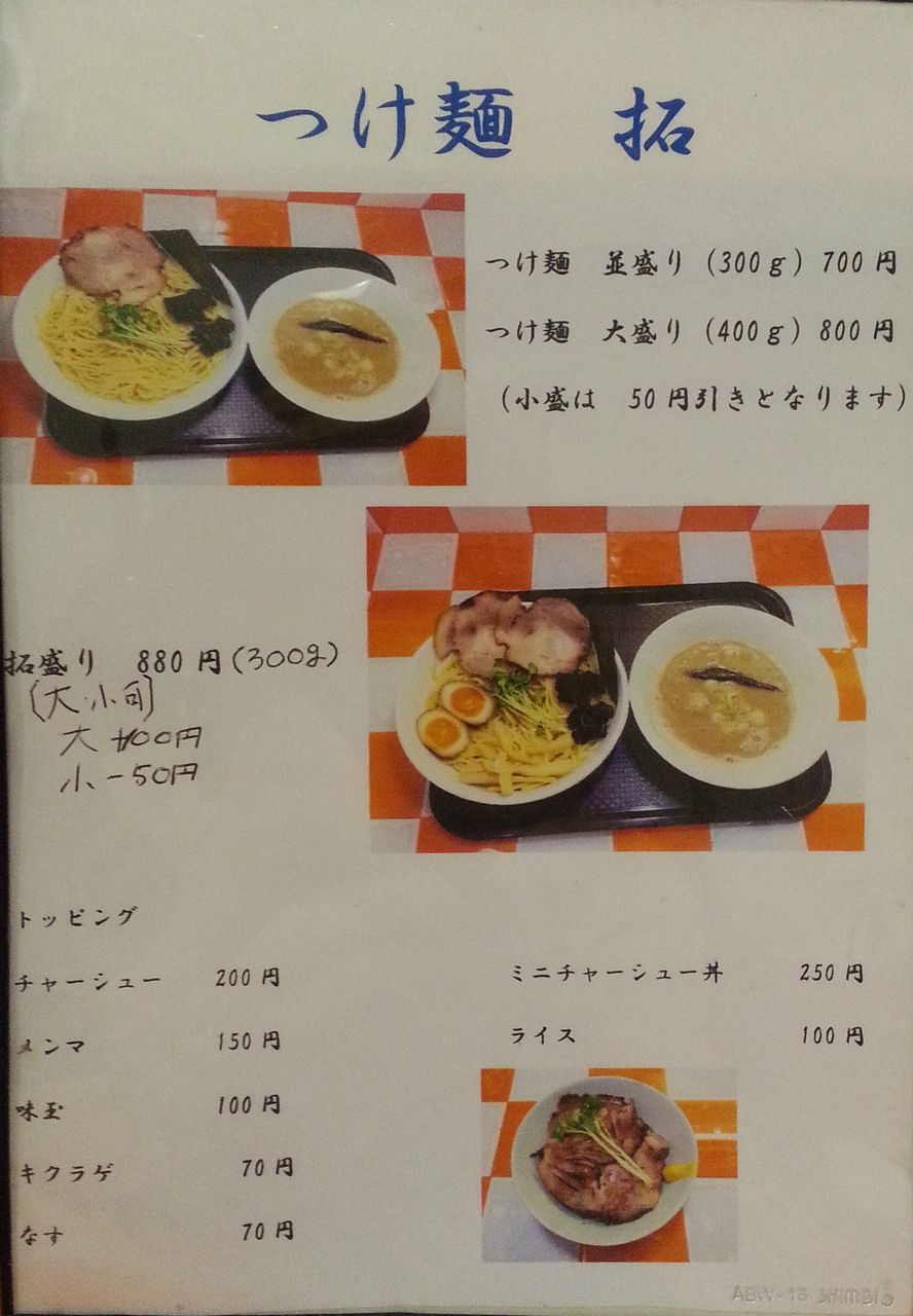 メニューはこんな感じで、麺類は「つけ麺」のみの量違いとトッピング違い。注文は基本?の「つけ麺大盛り」とランチサービスの「半ライス」を注文。