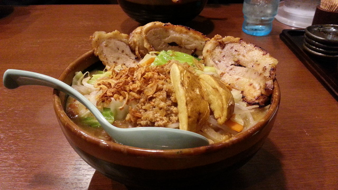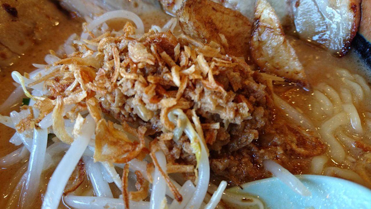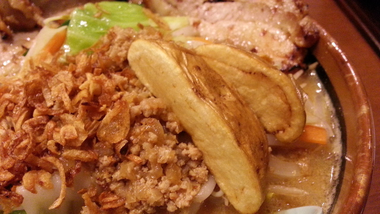 トッピングは、炙りチャーシュー・モヤシ・フライドオニオン・挽き肉・フライドポテト。