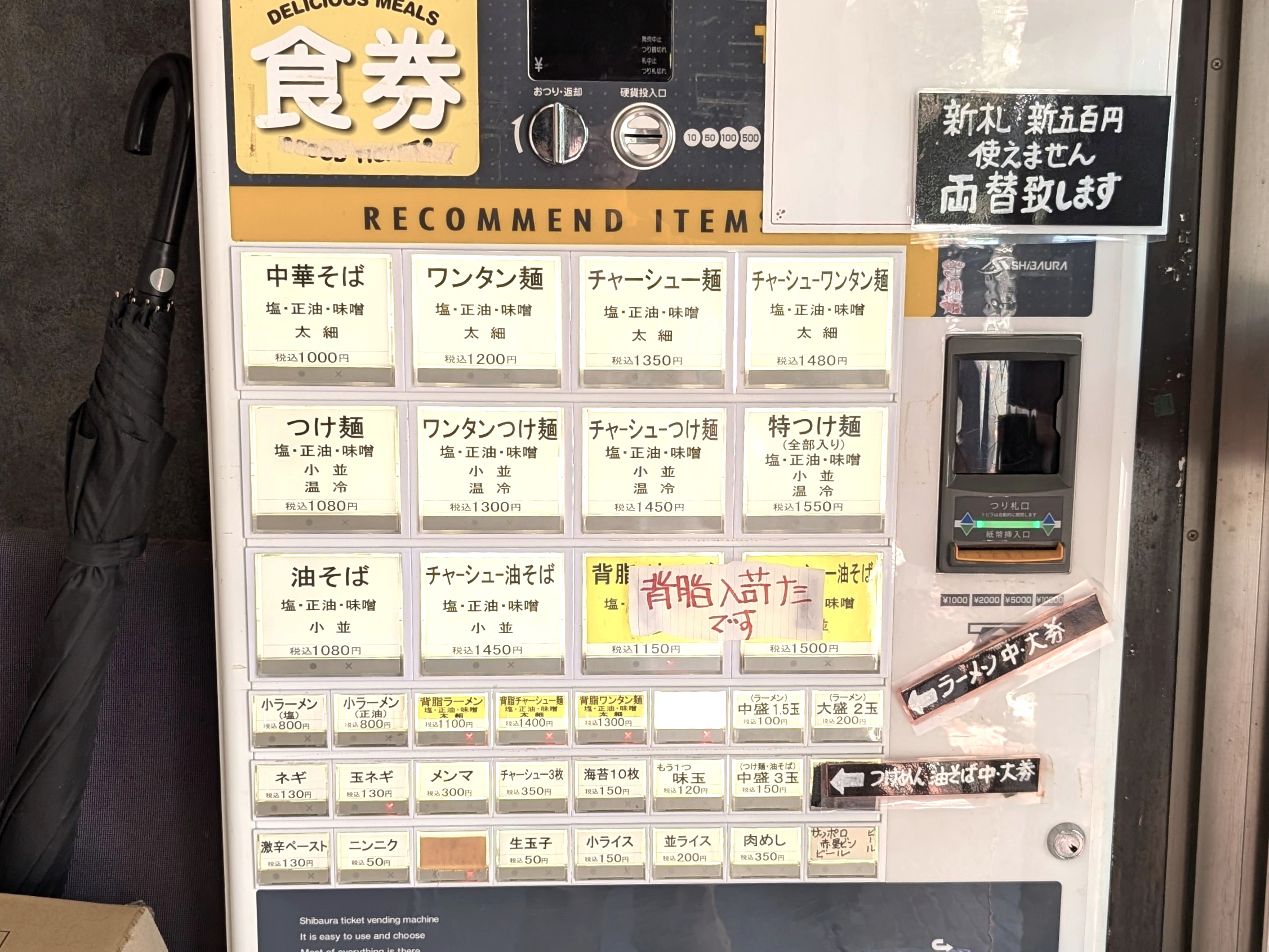 ってあれ…?大盛りがないってどゆこと?よくよく見たら、麺量の表記もなくなっているし、「油そばの冷やし出来ます」の表記までもがなくなっている。新札も新硬貨も未だ使えない。なんかいろいろナイナイナイ。。。