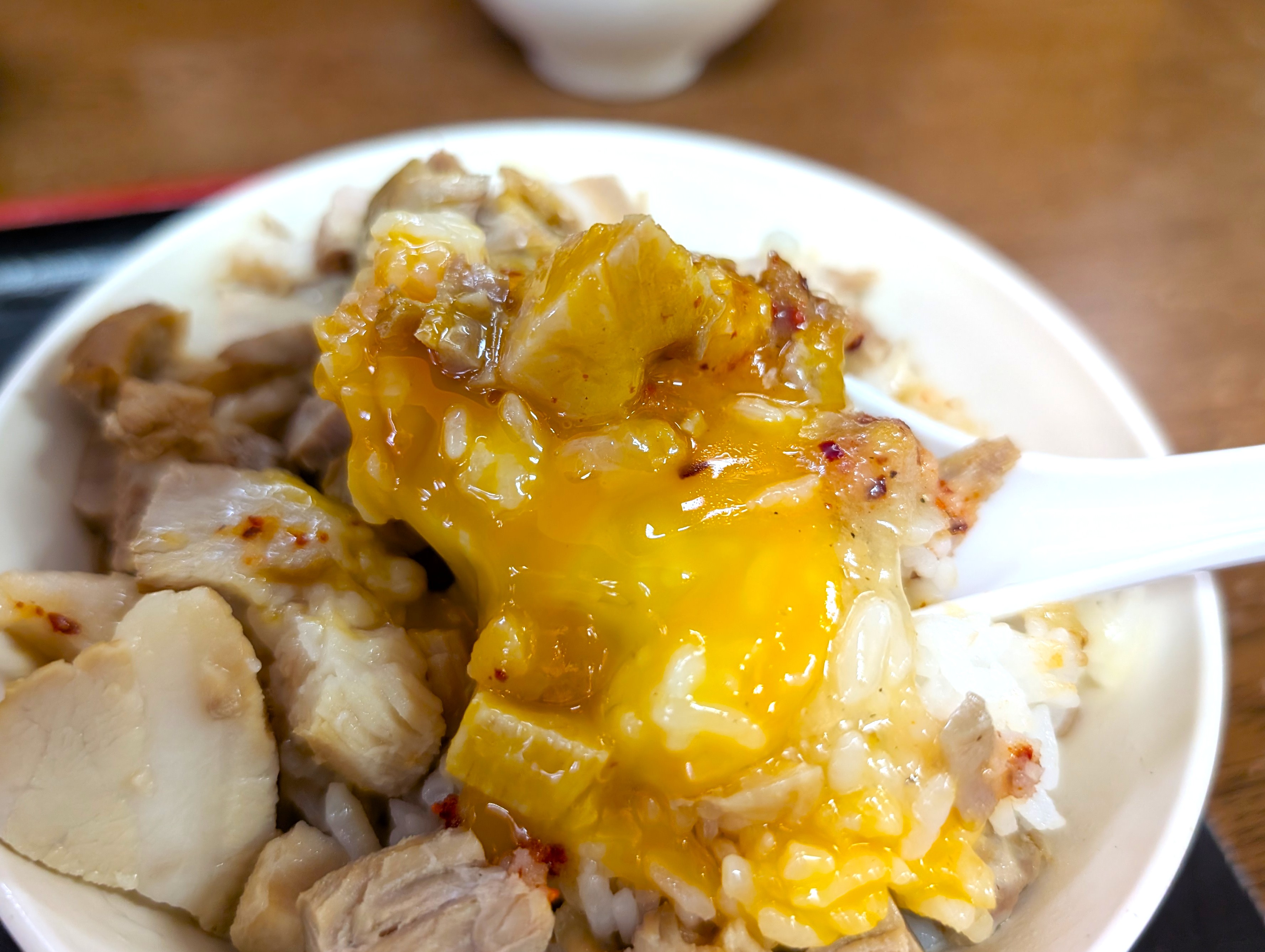 肉めしと遭遇出来たらマストバイだ。肉の下に隠されている全卵により、チャーシュー丼と言うよりかは肉だらけのTKG。油そばの強い塩気と相性がよろしく、箸休めのチェイサー的なポジションともなる。水の代わり的な。