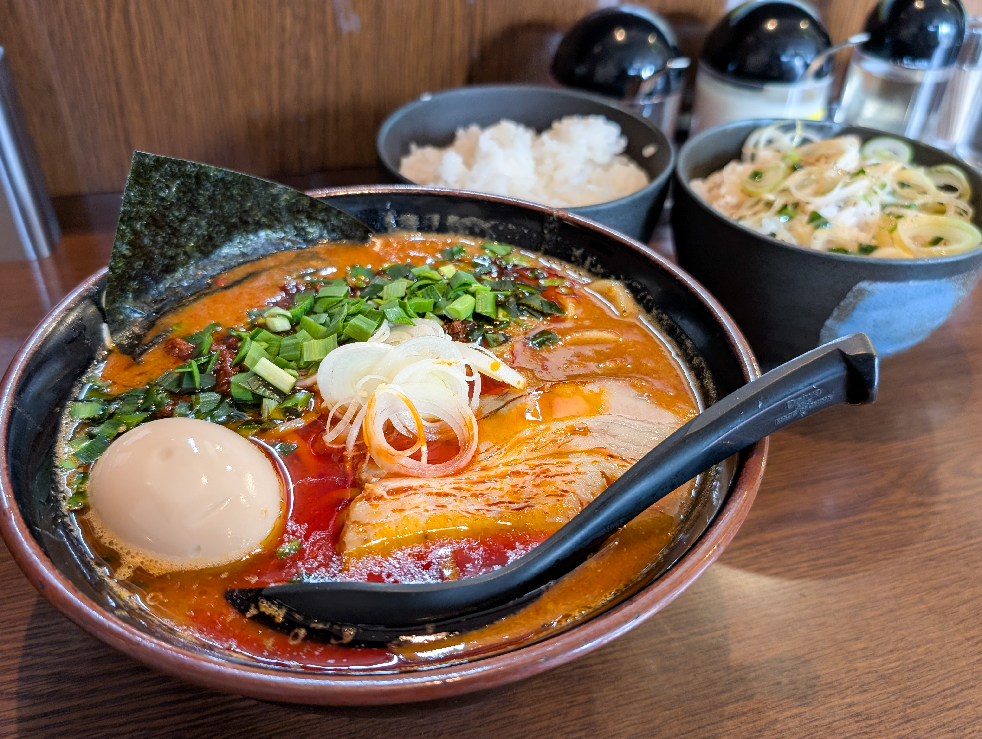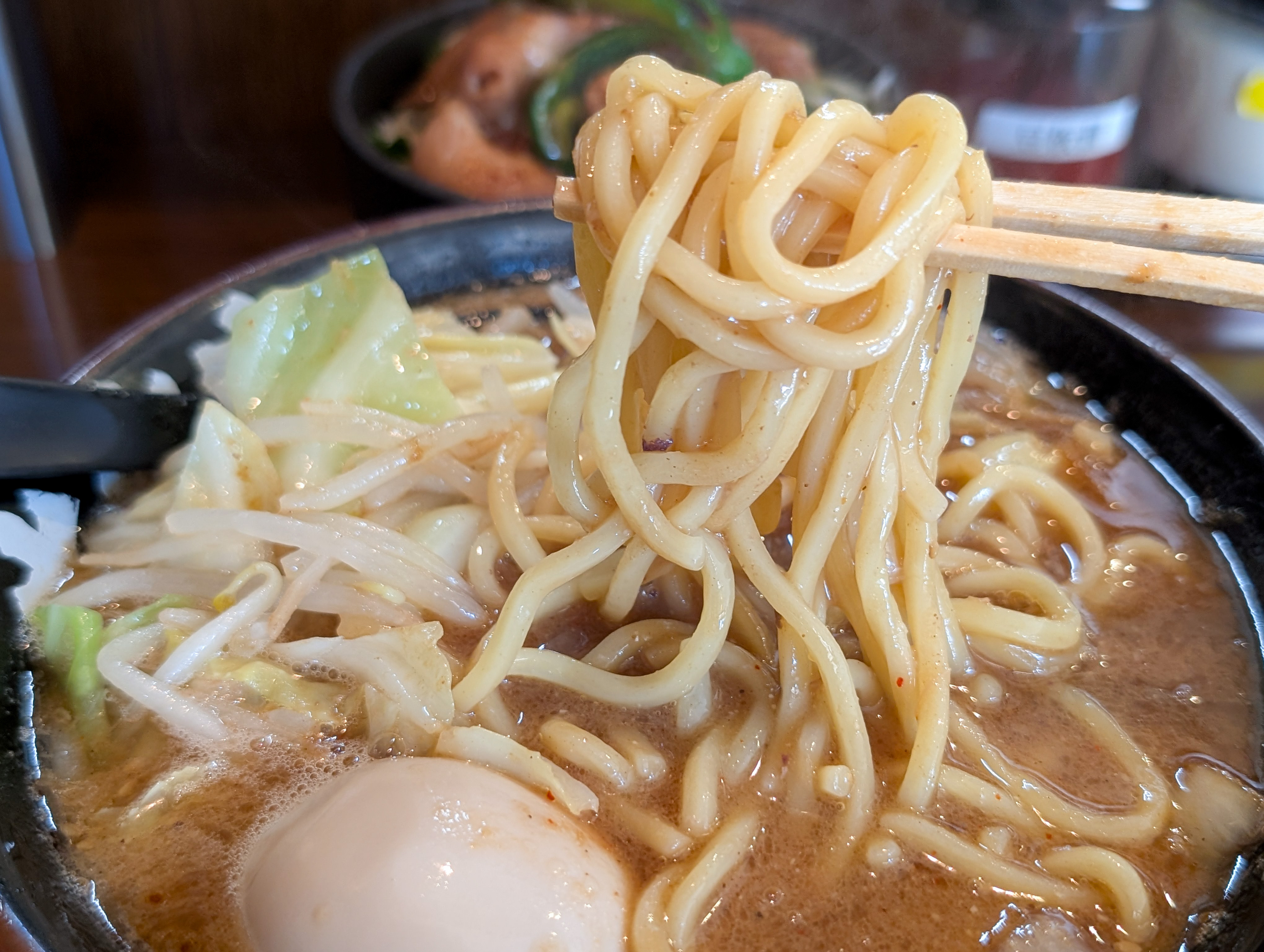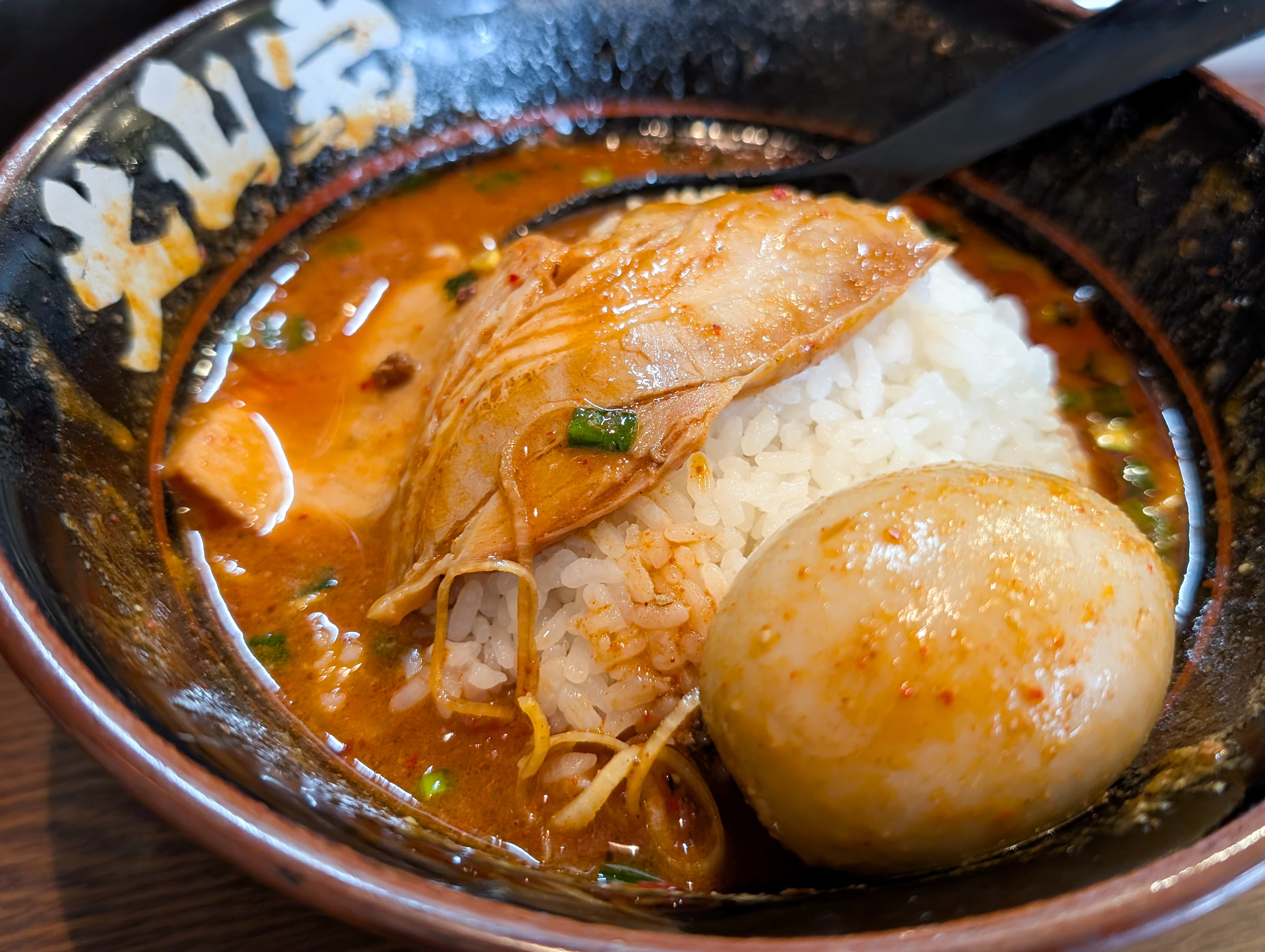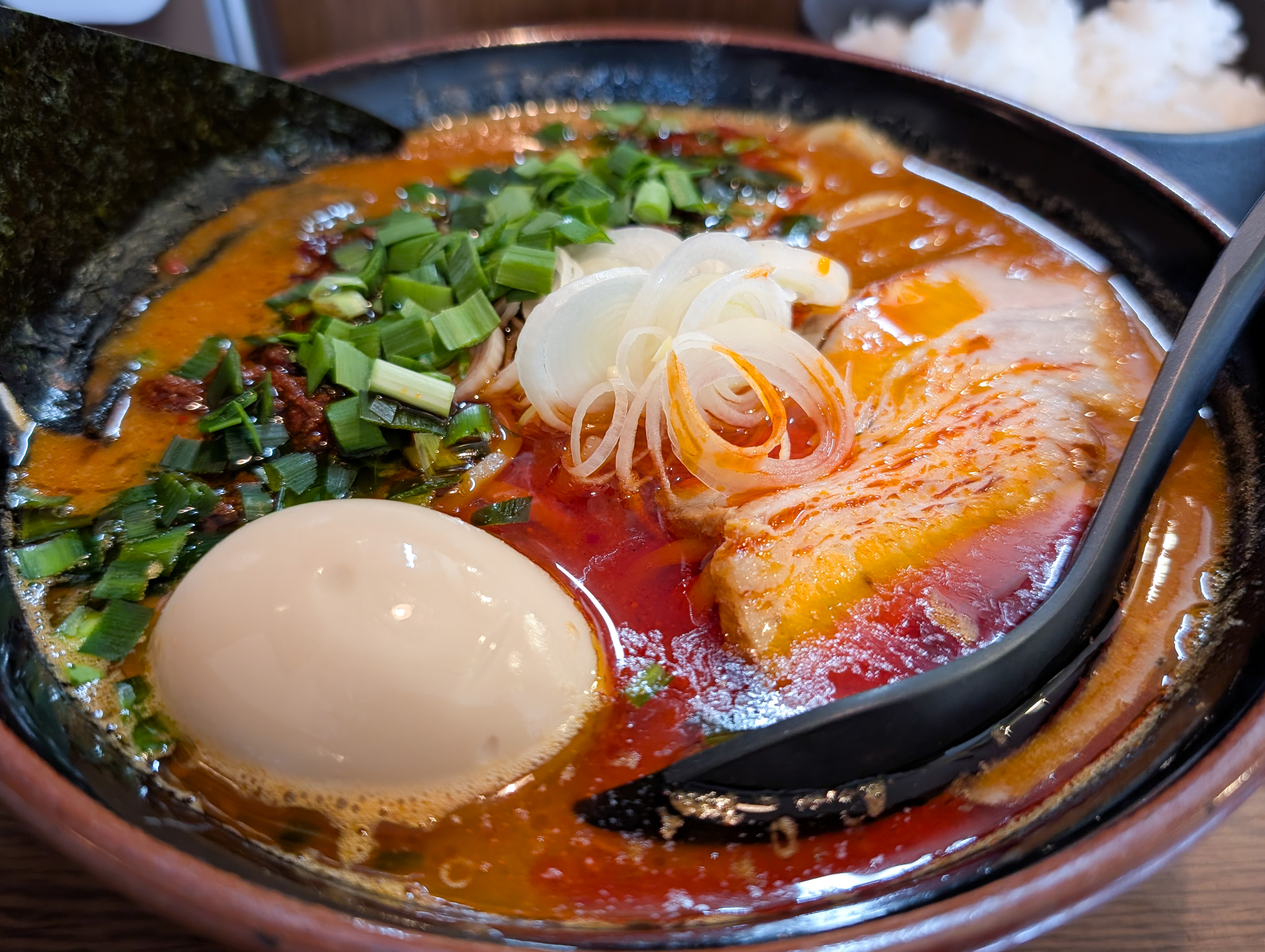 たしかに辛いっちゃ辛いが、噎せるような辛さではない。「赤とき卵」に比べたら殺傷力も低め。見た目以上にすすりやすく、味噌豚骨の風味もしっかりと味わえる。このくらいの辛さがちょうど良いね、うん美味しい!