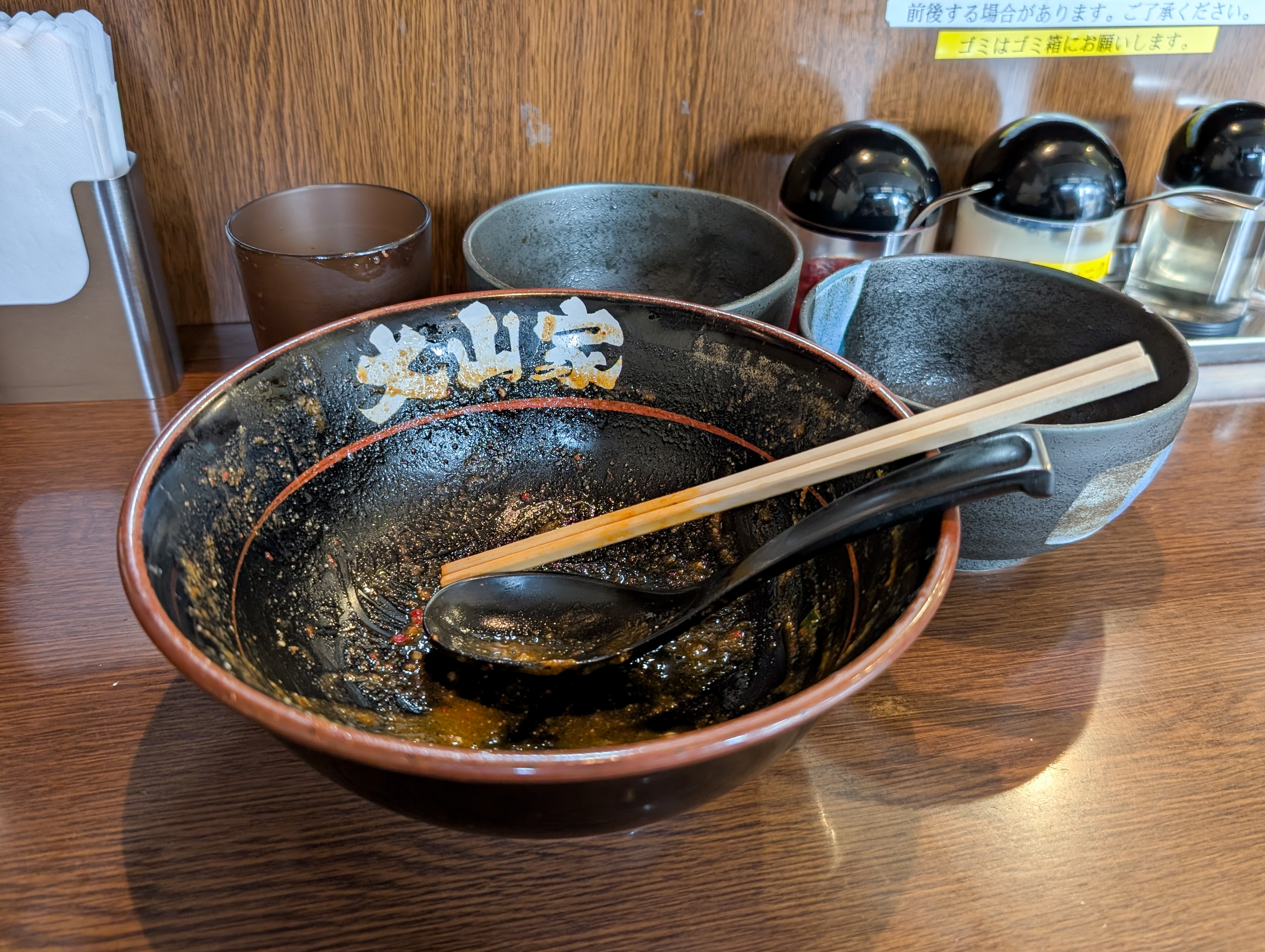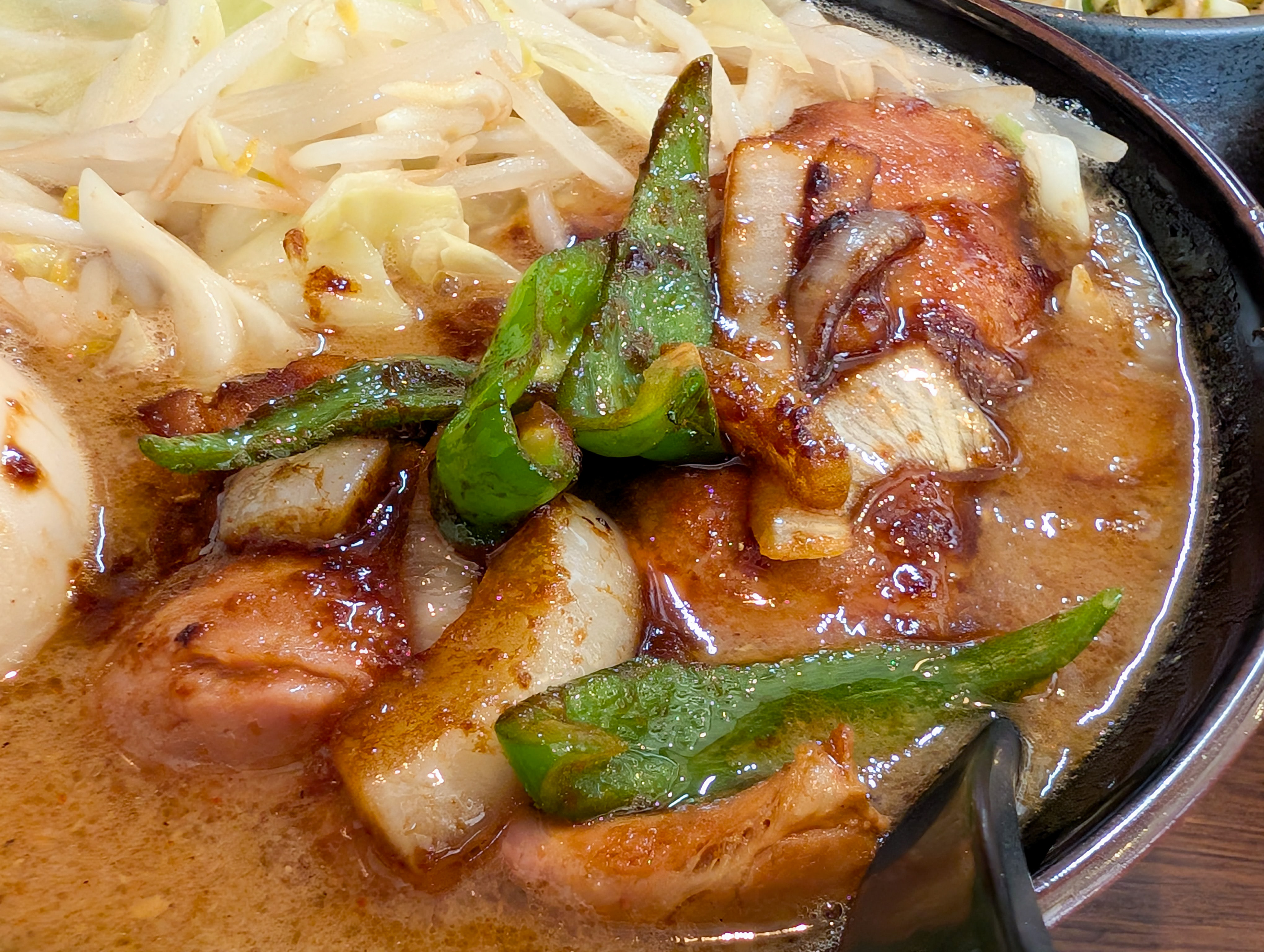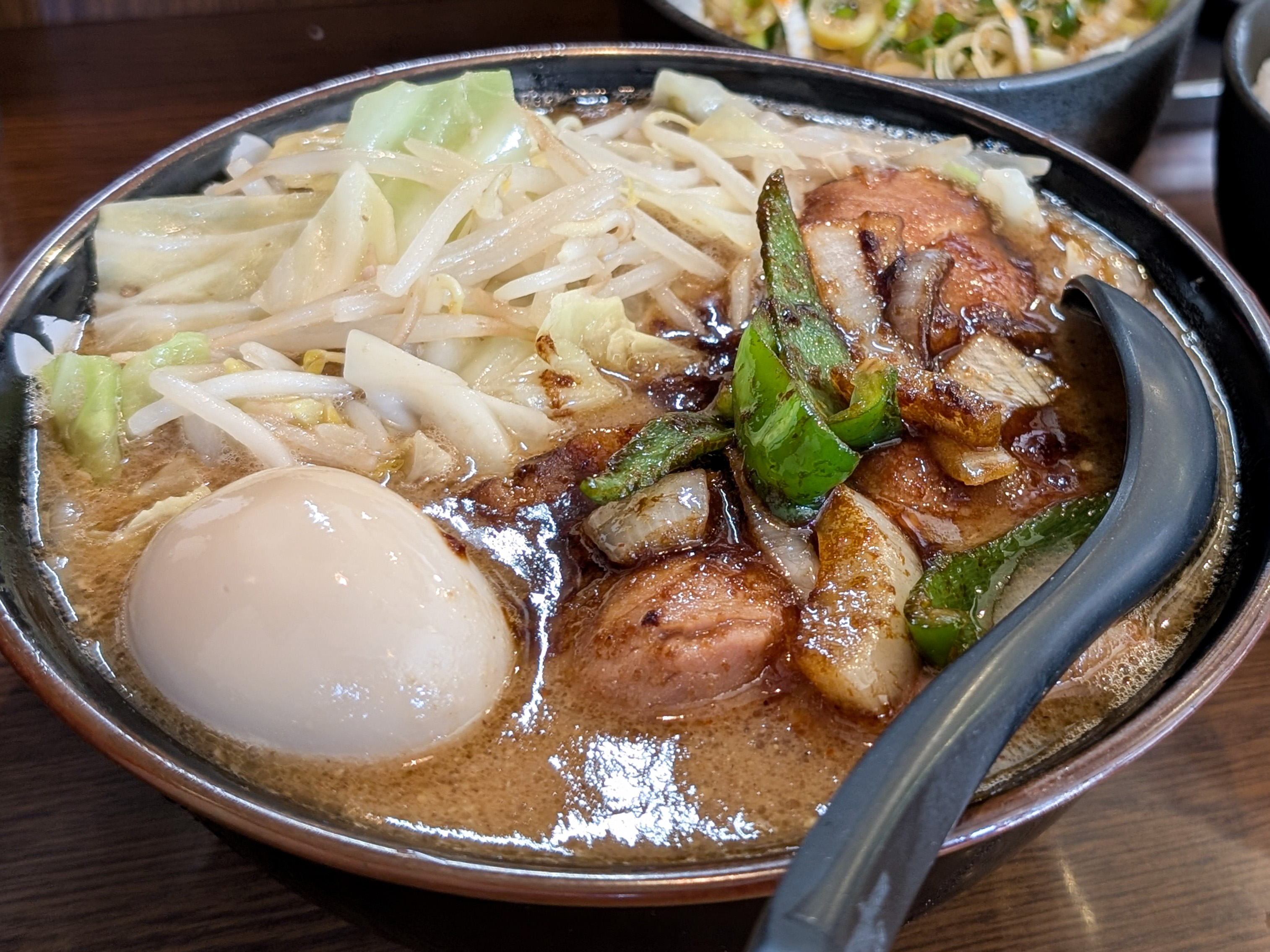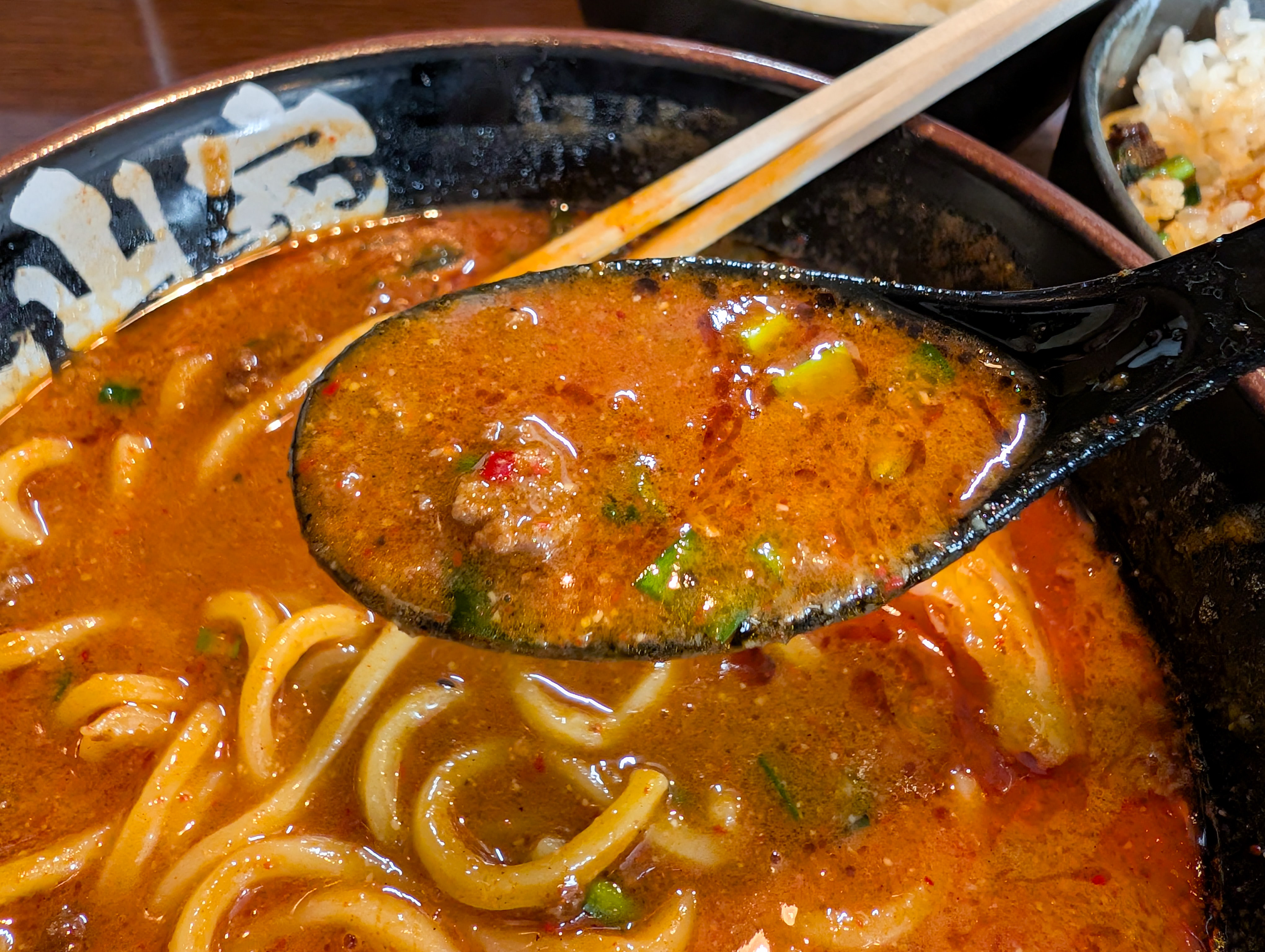 たしかに辛いっちゃ辛いが、噎せるような辛さではない。「赤とき卵」に比べたら殺傷力も低め。見た目以上にすすりやすく、味噌豚骨の風味もしっかりと味わえる。このくらいの辛さがちょうど良いね、うん美味しい!