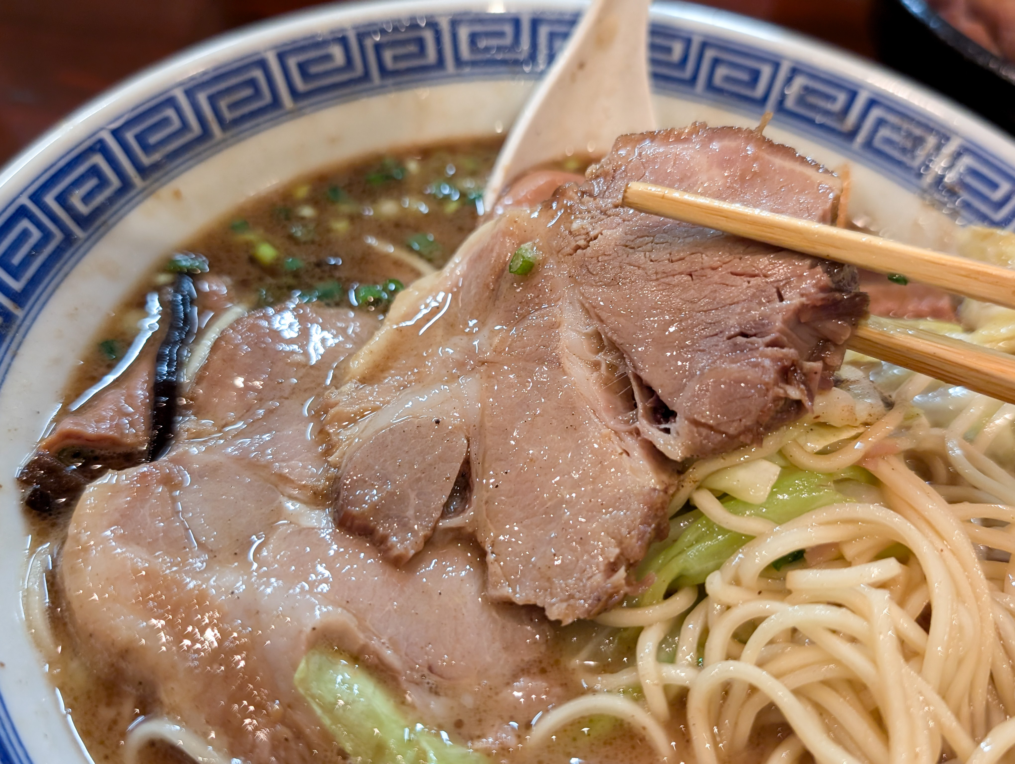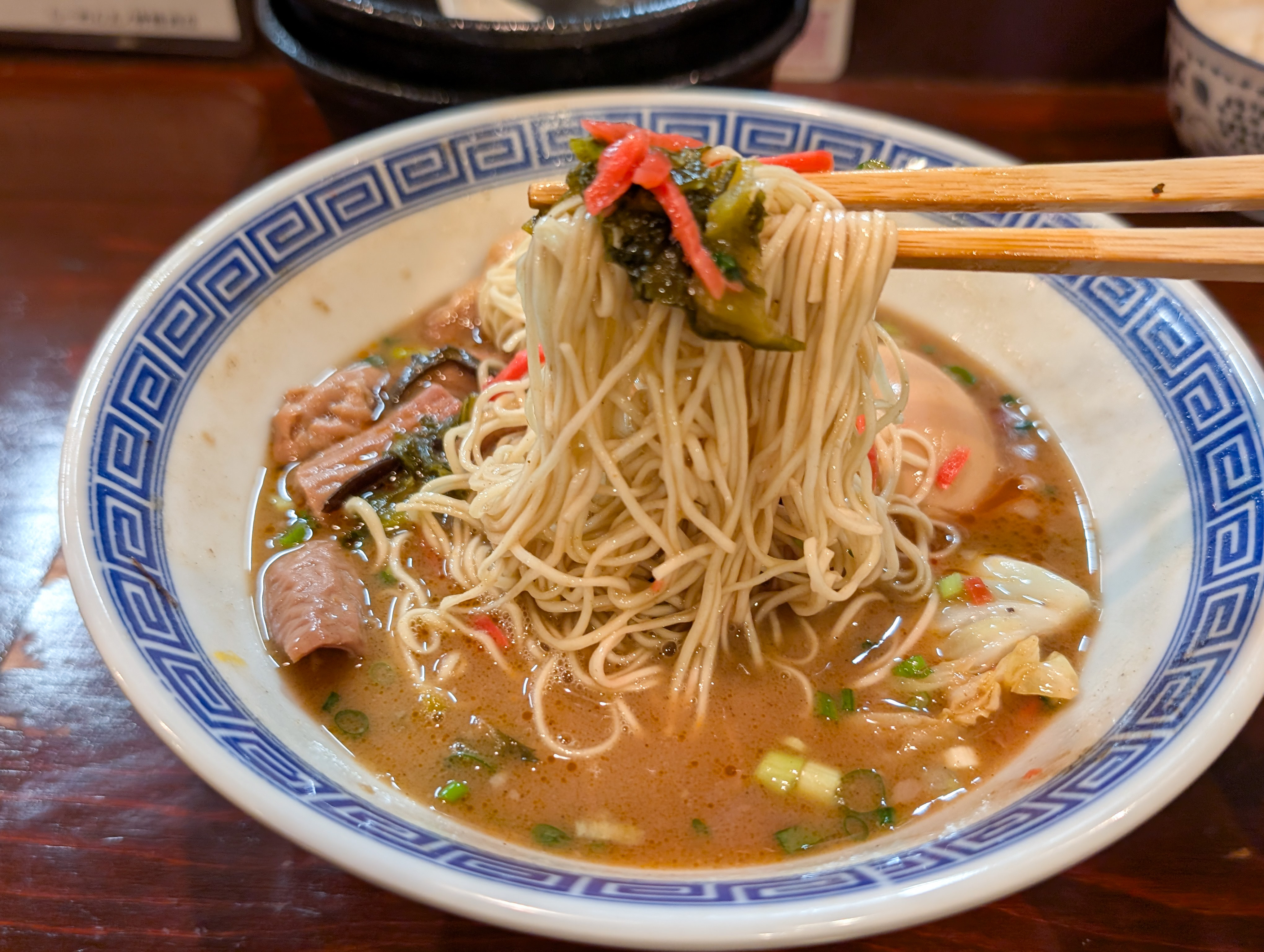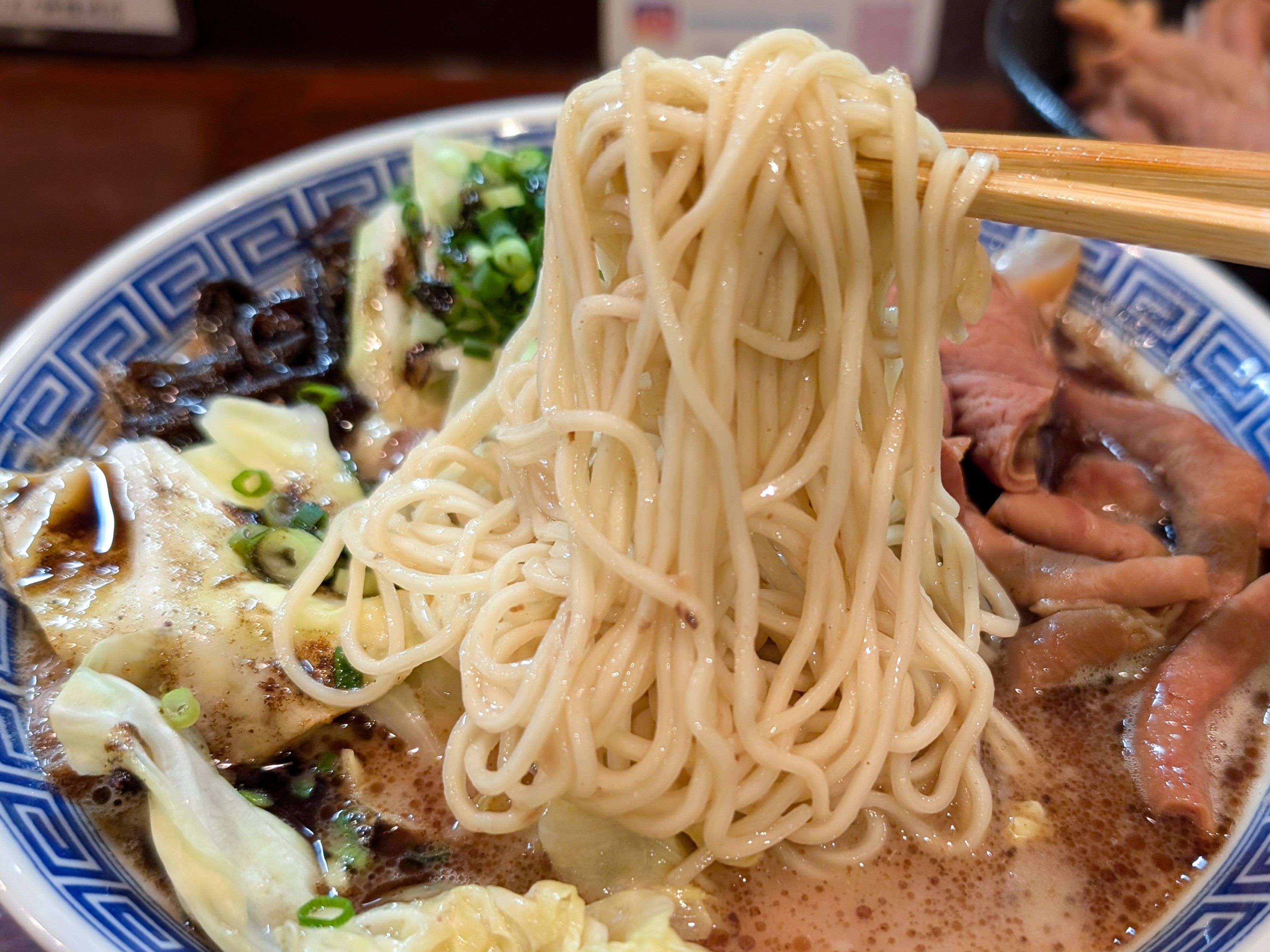 なによりマー油が似合い過ぎている。マー油好きなもんで贔屓目なのかもしれないが、雑味のないぺったりした豚骨スープに、かるいビターな風味とオイリーなアクセントがアドして超~美味い。