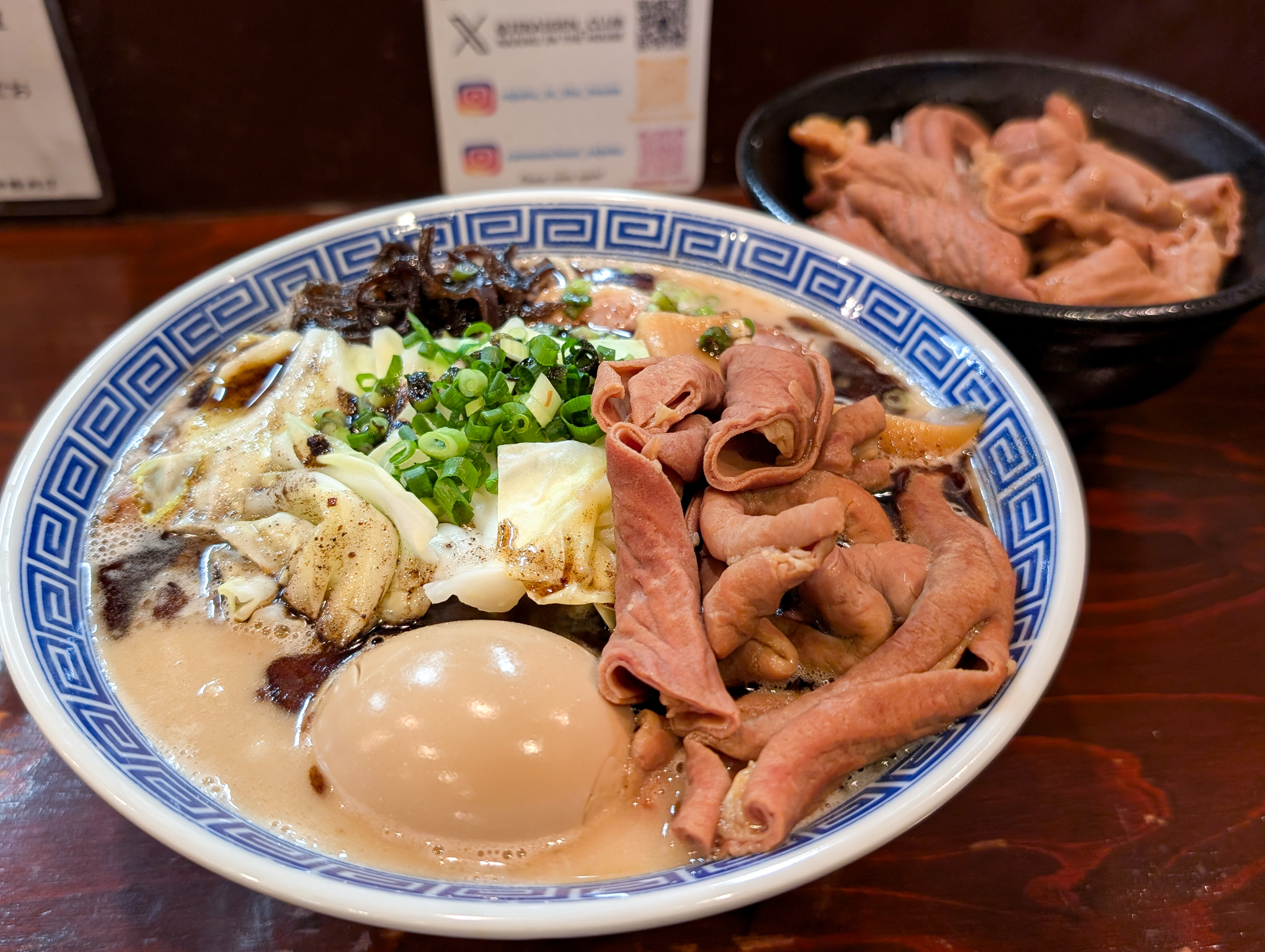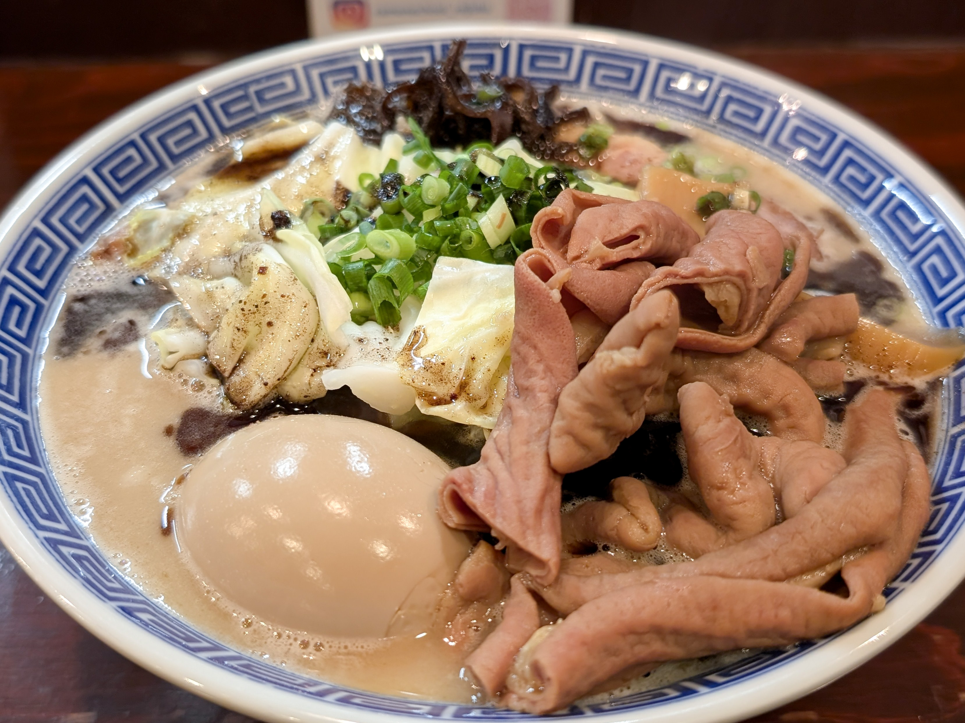 イイじゃん! なんとも “もつもつな豚骨らーめん” が配膳された。肉の日でもないのに豚づくしである。